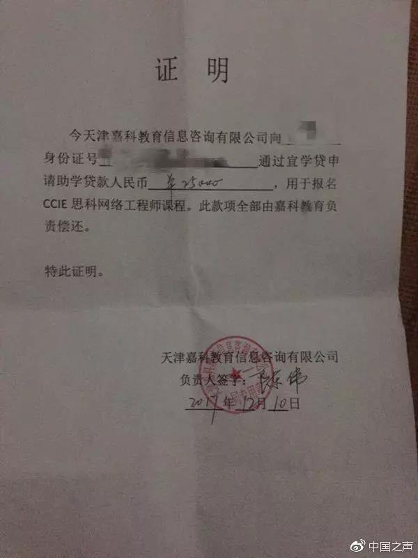 如此轻松便获得了报酬,小张开始对工作人员在手机上进行的操作产生怀疑,一再追问之下才得知,嘉科培训以缴纳课程培训费为由,获取并利用他们的身份信息申请网络贷款25000元。不过,嘉科培训向他们承诺这些贷款并不需要学生们偿还,培训机构每月会按时替他们还款,并且写下了一个证明。
