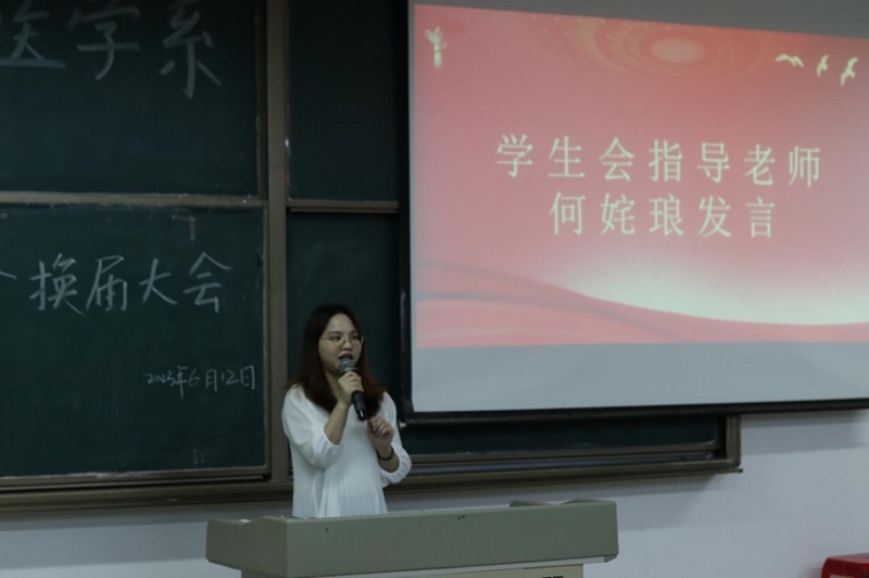 会议第四项,陈咏嫦老师与何姹琅老师依次上台发言,充分肯定了上一届学生会全体成员做出的成绩。其中,何姹琅老师讲到,希望新一届学生会的每一位成员要将严于律己落实到行动上、细节上,积极参与各项活动,信念坚定、实事求是,勇于担当、善于作为。珍惜锻炼的平台与机会,热心服务同学,以强烈的责任心彰显奉献和担当,带领同学们向更好的目标前进,共赴美好新征程。