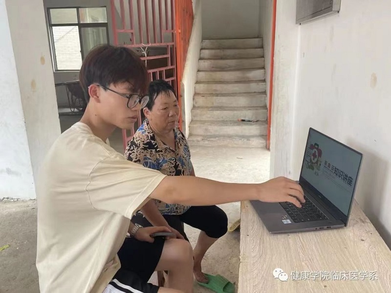 7月6日早上,学生们携带电脑和宣传手册,挨家挨户给村民们科普高血压及风湿病防治知识,他们结合扎实专业基础,采用PPT讲解和提问的形式,深入浅出、风趣幽默地为村民们做了精彩讲解,讲解内容围绕高血压与风湿病两种疾病的现状、带来的危害以及如何做好自我预防展开科普,并纠正了部分村民对高血压及风湿病的错误认识。