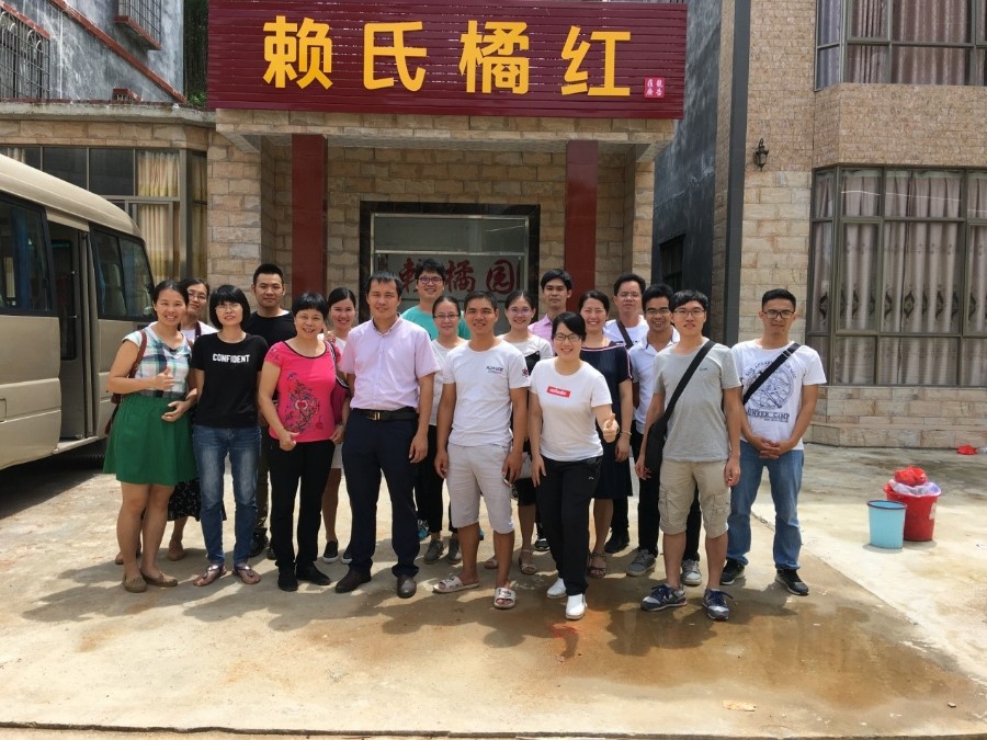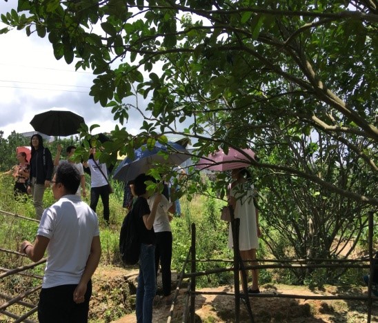 接着,我们在廖昌恒老师和赖氏橘红赖总的带领下,来到化州平定镇橘红种植基地,时值6月底,橘红的采收和杀青季节已过,我们参观的橘红种植基地虽然没有橘红果实挂着枝头,但通过赖总、傅总和当地农民的介绍,我们了解当地的土壤性质、气候条件、橘红的生长习性、橘红的病虫害情况及处理等知识。