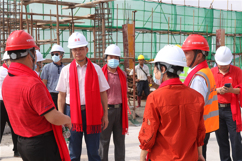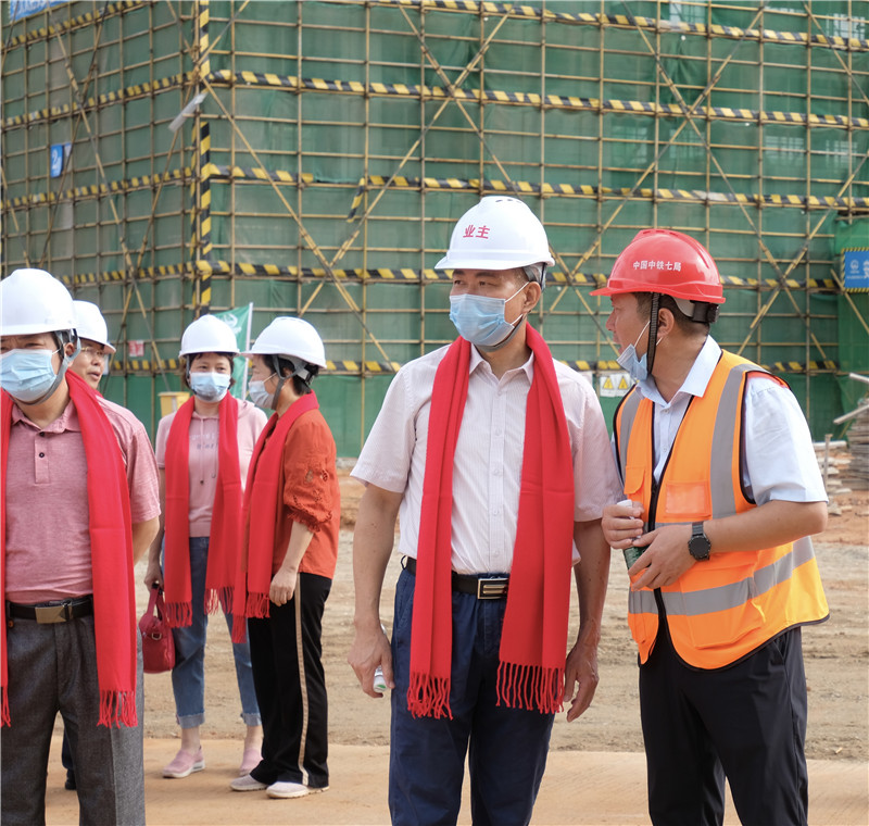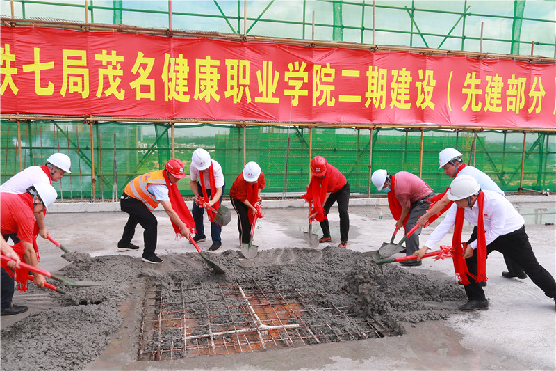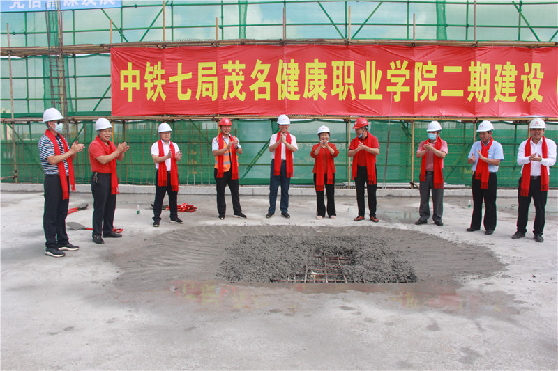 学院领导、中铁七局负责人、监理方负责人到综合楼楼顶共同为广东茂名健康职业学院二期建设(先建部分)项目封顶。