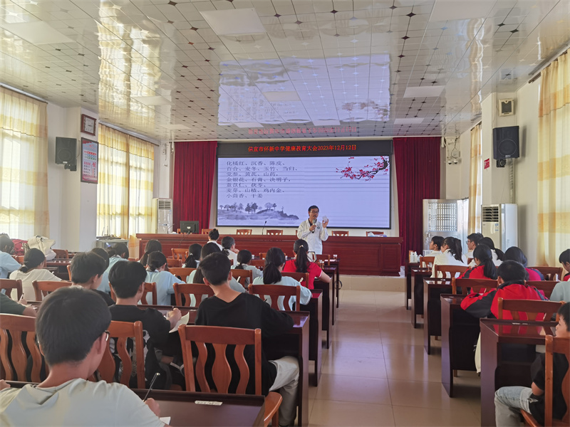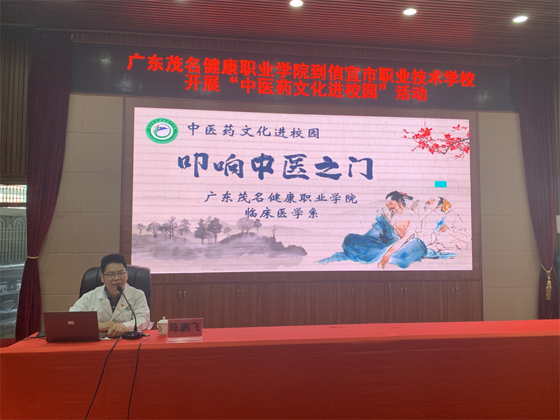 2023年12月12日,广东茂名健康职业学院临床医学系骨干教师团队前往信宜市怀新中学、信宜市职业技术学校、信宜市丁堡职业高级中学开展“中医药文化进校园”活动。参加活动的师生约500人。本次活动主要包括叩响中医之门、常见20种中药辨识和中医适宜技术(刮痧、拔罐、推拿)互动体验等。