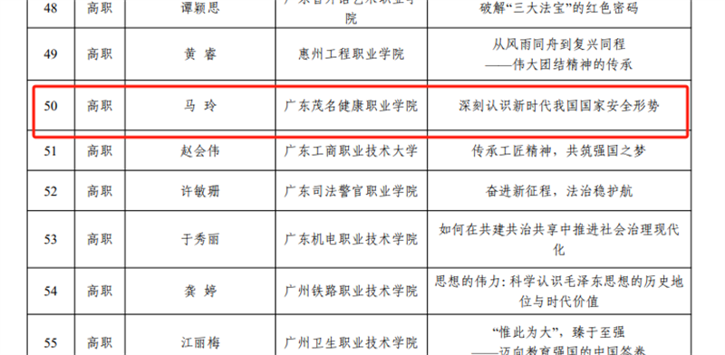 近日,由广东省教育厅主办的2025年大中小学思政课一体化教学展示交流活动结果揭晓。广东茂名健康职业学院马玲老师提交的课例经过严格评审,脱颖而出,荣获省优秀教学课例三等奖。