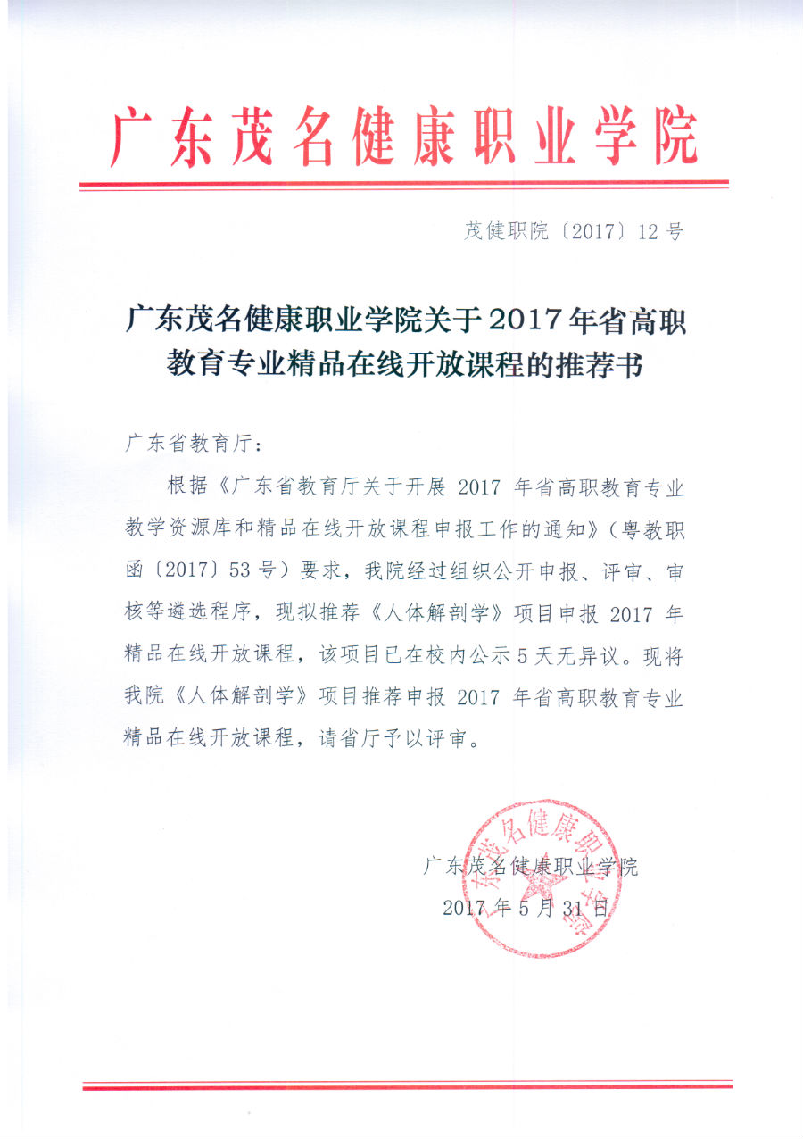 广东茂名健康职业学院:《人体解剖学》精品在线开放课程推荐书扫描件