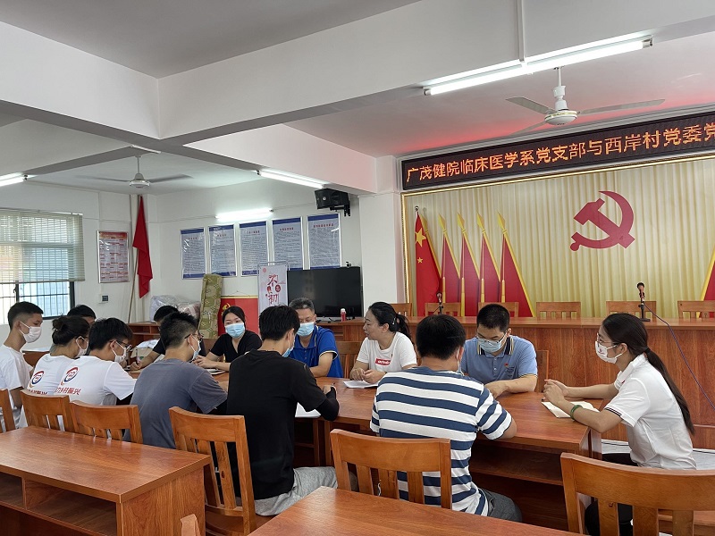 调研队来到了高州市宝光街道西岸参加居委会召开的座谈会。会议上,西岸村村委会负责人介绍了当地基本情况后,临床系党支部负责人陈应娟就普通话推广、义诊活动、乡村产业振兴等方面发表讲话,并表示会协助村委会本次防溺水工作的开展,希望能够通过调研队成员们的努力,为当地乡村振兴发挥作用。