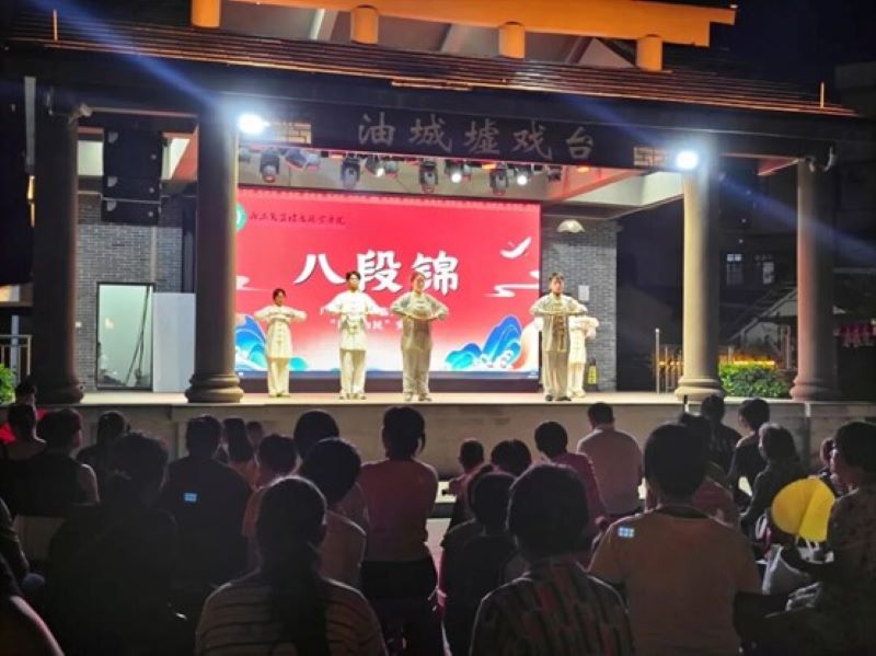 为助力油城墟“逛油城墟,周周有戏睇”系列活动,让传统养生文化浸润市集烟火气,7月11日晚,临床医学系“医心为民”突击队在油城墟戏台上演了一场别有意境的八段锦夜演,让古老的养生智慧在夜色中悄然融入乡土肌理。