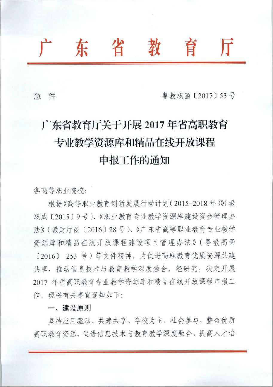 广东省教育厅关于开展2017年省高职教育专业教学资源库和精品在线开放课程申报工作的通知