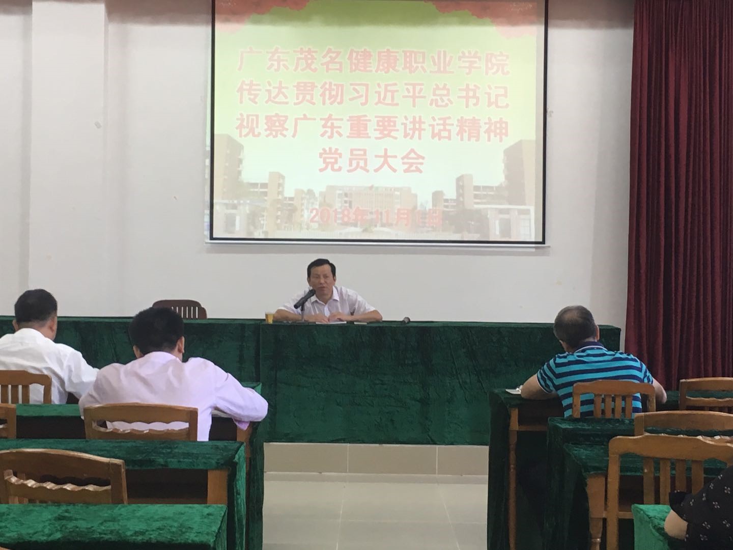 2018年11月1日下午,广东茂名健康职业学院在图书馆七楼召开全体党员学习大会,杨云同志传达学习贯彻习近平总书记视察广东重要讲话精神,并带领全体党员重点学习了习近平总书记在珠海、清远、深圳、广州四个考察点的主要讲话内容。