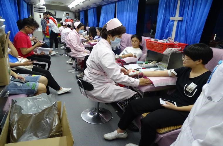 献血现场有四辆献血车,血站工作人员和学院志愿者们早已准备就绪,下午3时,无偿献血活动正式开始。前来报名的同学很多,他们表现出了自己的人道主义风范,促进了社会主义物质文明和精神文明建设,更表现了当代大学生的爱心风采和团结奋斗的力量。他们还不时地向血站工作人员询问关于献血的有关规则和献血小知识。同学们有序地排起长队,依次进行信息登记、血液类型检验、静脉采血等环节。等待献血期间,同学们紧张而兴奋,其中不乏参加过献血活动的同学,但是他们仍旧为自己的行动能给需要的人提供帮助、挽救更多的生命而感到高兴。