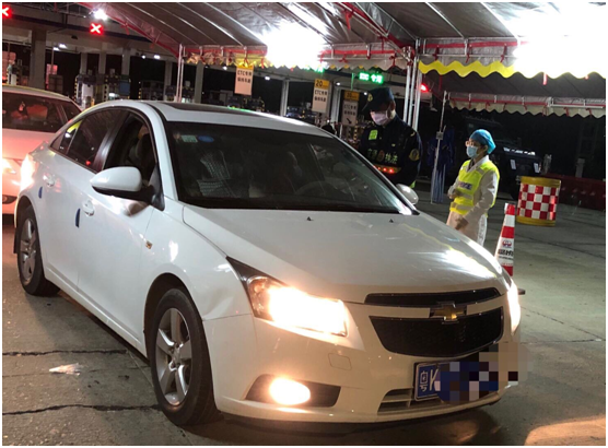 图为学院沈海高速茂名出口志愿服务队临时党支部书记游伟东(左一)深入沈海高速茂名出口检查指导疫情防控工作