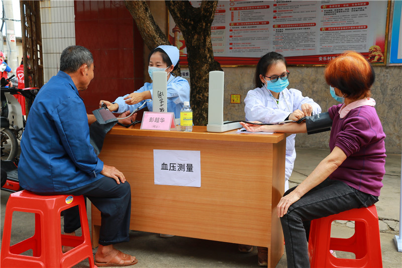 熊海燕副主任护师、彭超华老师为村民测量血压