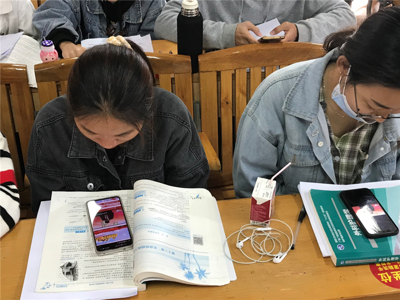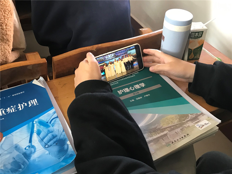 图为学生观看“宪法晨读”直播活动。