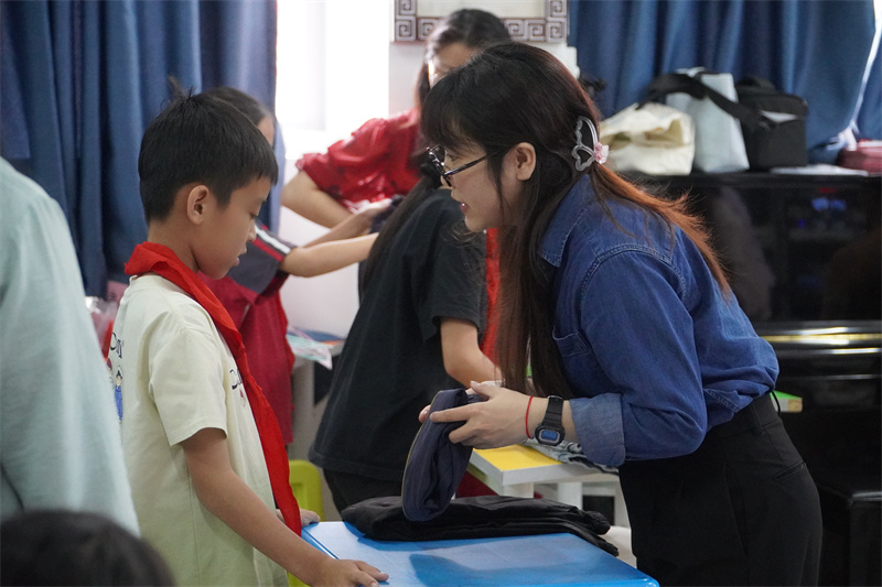 分组实操环节依据学生年龄段特点,设置差异化教学内容:一二年级学生重点开展“书包整理”训练,三四年级学生学习“衣橱整理”技能,五六年级学生进行“书柜整理”实践。魏老师耐心细致地开展手把手教学、一对一指导,确保每位学生掌握相关要领。